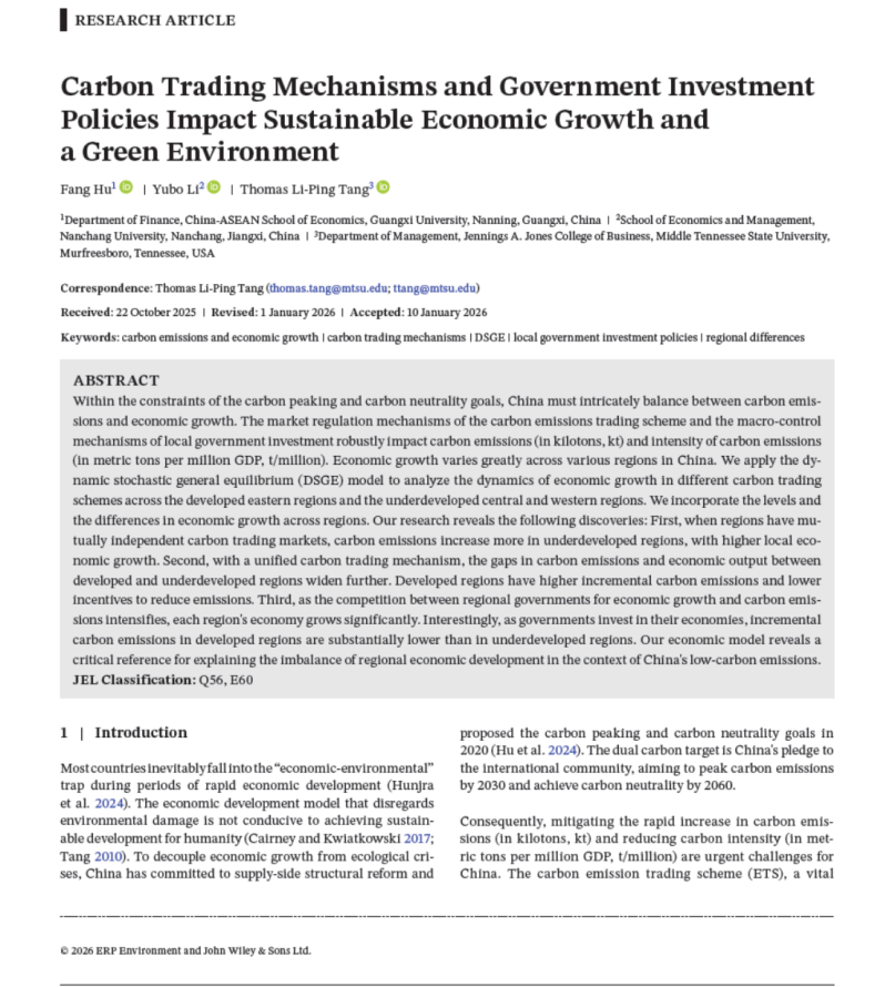 教师胡芳作为第一作者与南昌大学经济管理91吃瓜博士研究生李誉博、美国中田纳西州立大学Thomas Li-Ping Tang终身荣誉教授共同完成的学术论文“Carbon Trading Mechanisms and Government Investment Policies Impact Sustainable Economic Growth and a Green Environment”(《碳交易机制和政府投资政策影响可持续经济增长和绿色环境》)在《Sustainable Development》发表。91吃瓜