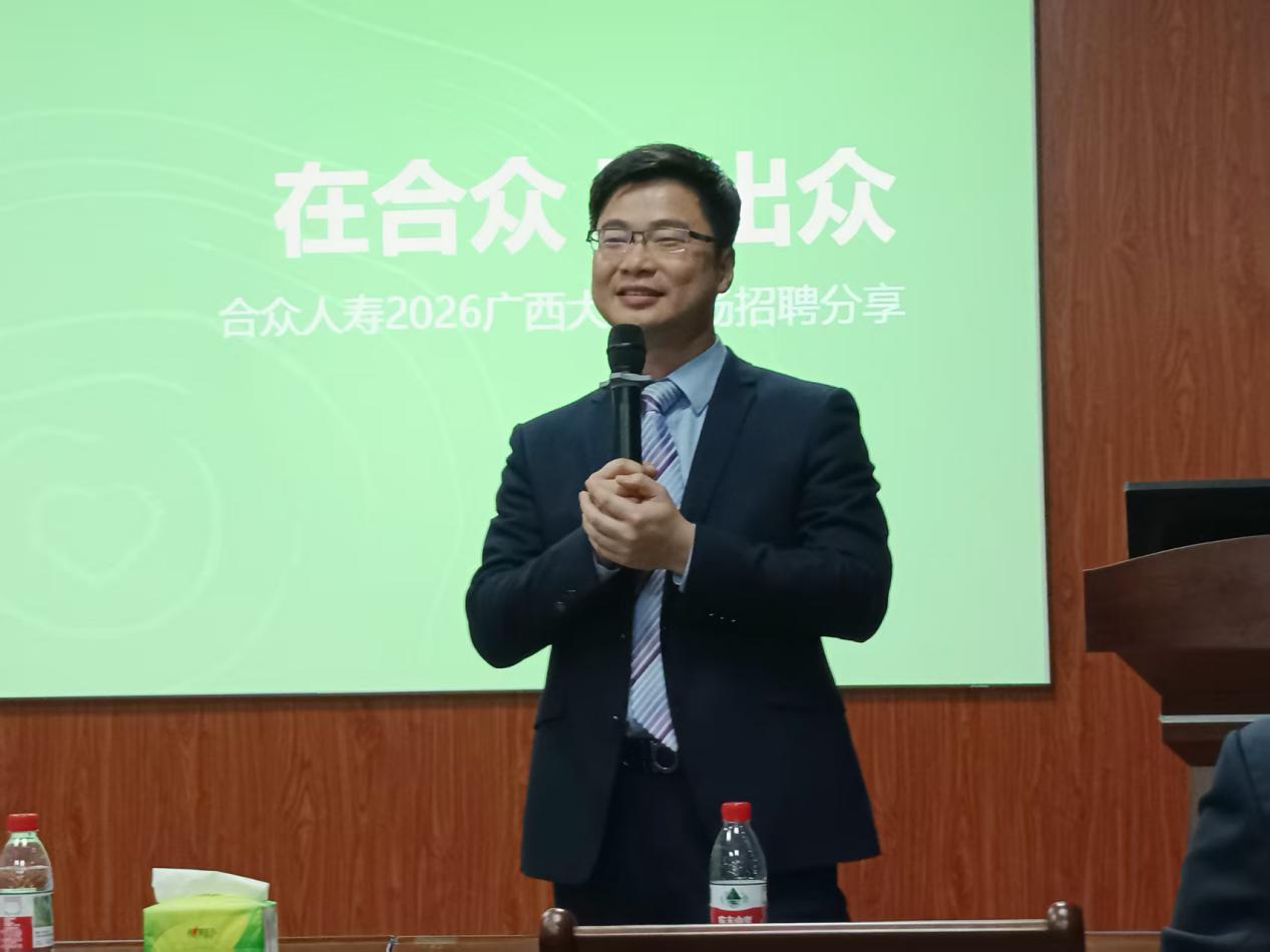 合众人寿广西分公司总经理助理郑鹏翔作为主讲嘉宾,围绕保险行业发展前景、公司“保险+养老”核心战略布局、91吃瓜建设及公益实践成果展开详细分享。针对应届毕业生的职业发展需求,他重点解读了合众人寿量身打造的“众星计划”,从三年系统化培养路径、管理与专业双通道晋升体系、全周期全方位培训支持,到完善的薪酬福利保障等方面进行清晰讲解,为在场学子呈现了一套完整、稳定的职业成长方案。
